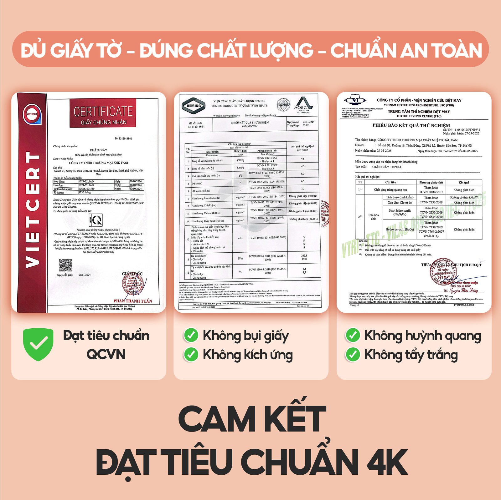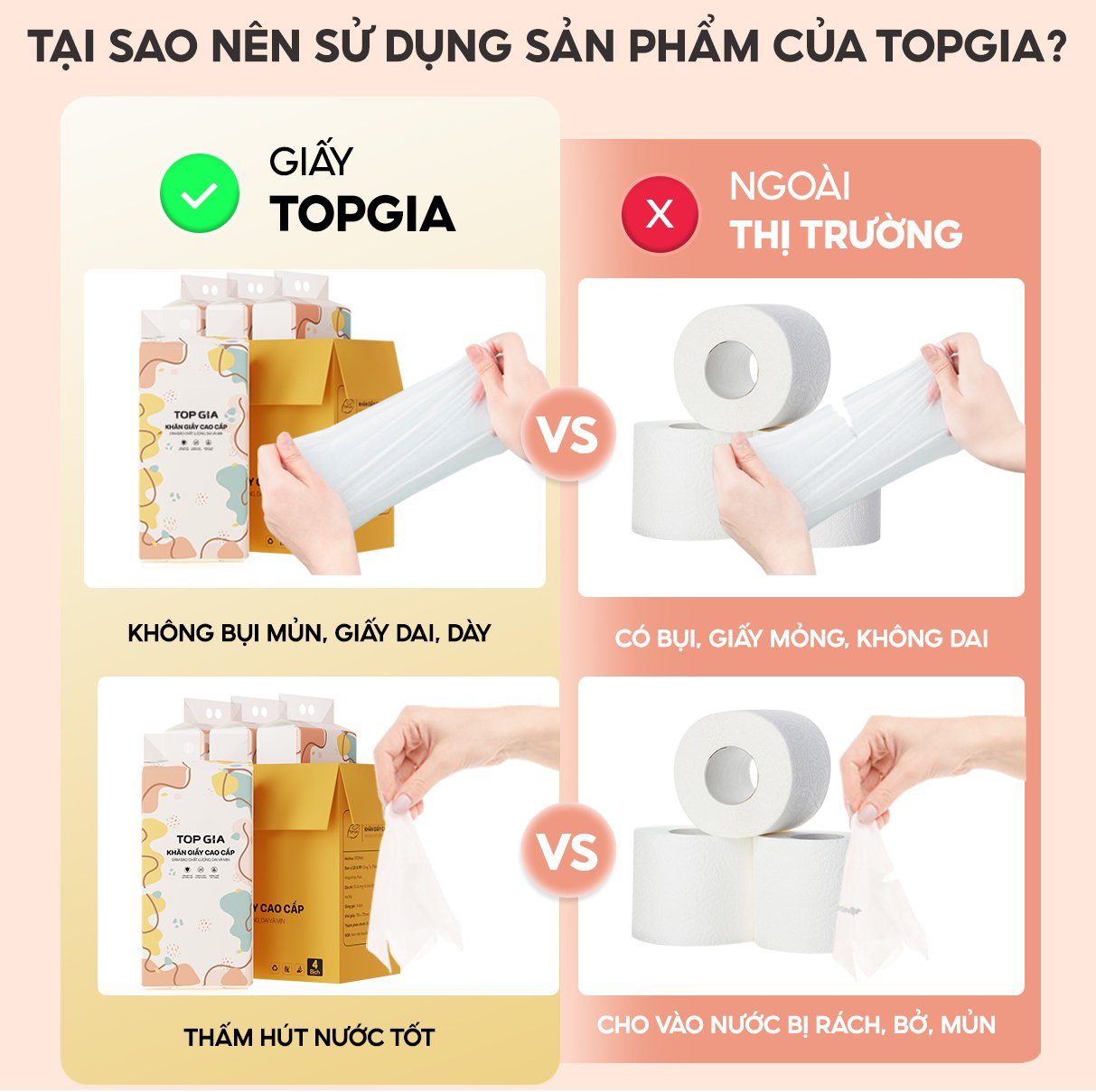 – Khăn giấy vệ sinh có độ dai tự nhiên, không có bụi, mủn giấy; thấm nước không rách, nát; bề mặt giấy mềm mịn, không làm hại da, không gây kích ứng nên phù hợp với cả làn da nhạy cảm.