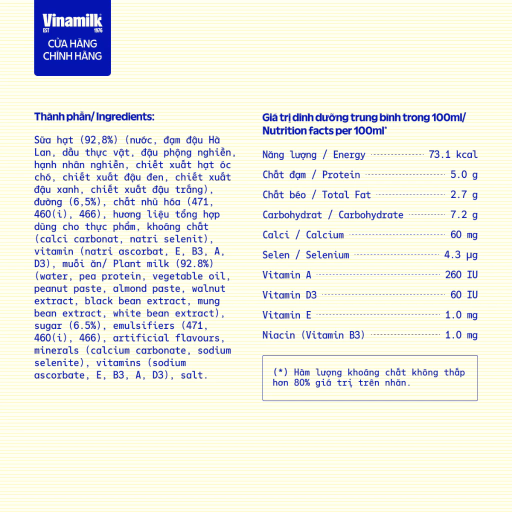 Sữa hạt Cao đạm không đậu nành đầu tiên tại Việt Nam, vị ngon độc bản từ 7 loại hạt cao cấp (óc chó, hạnh nhân, đậu hà lan, đậu phộng, đậu xanh, đậu trắng, đậu đen) lần đầu tiên có mặt tại Việt Nam. Sản phẩm bổ sung đạm chủ yếu từ đậu hà lan cung cấp đủ 9 loại amino acids mà cơ thể không thể tự tổng hợp, vừa thơm ngon đậm đà, vừa giúp dày cơ tiếp sức.