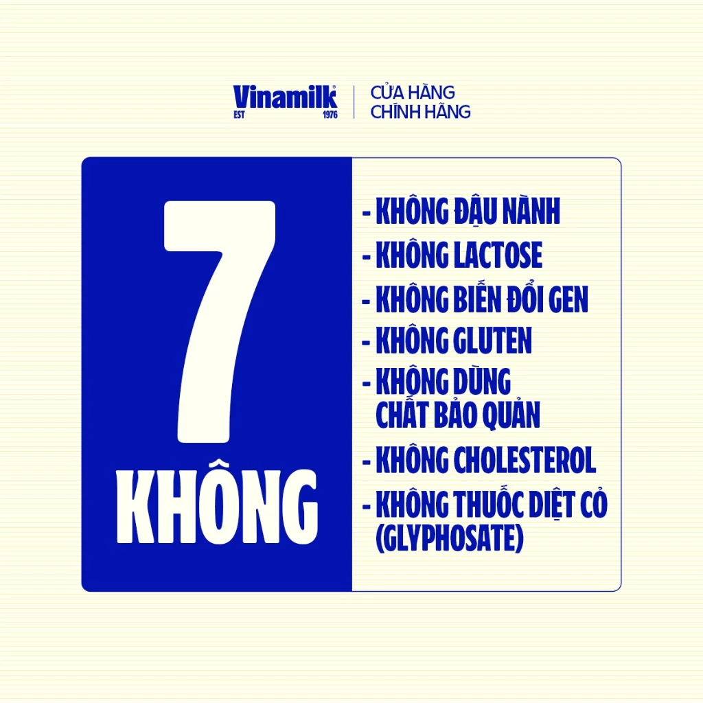 Chất lượng 7 không: không đậu nành, không lactose, không biến đổi gen, không gluten, không dùng chất bảo quản, không cholesterol, không thuốc diệt cỏ (glyphosate)